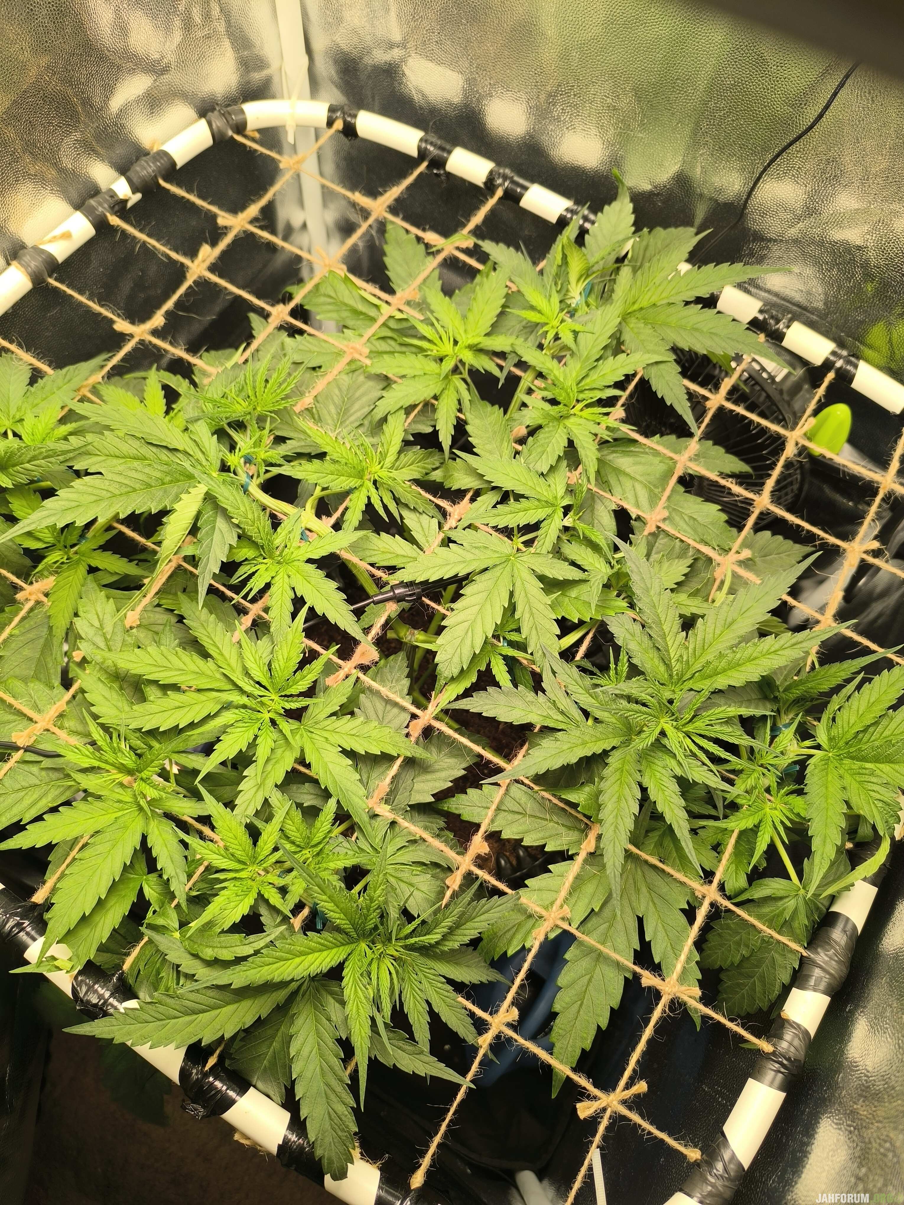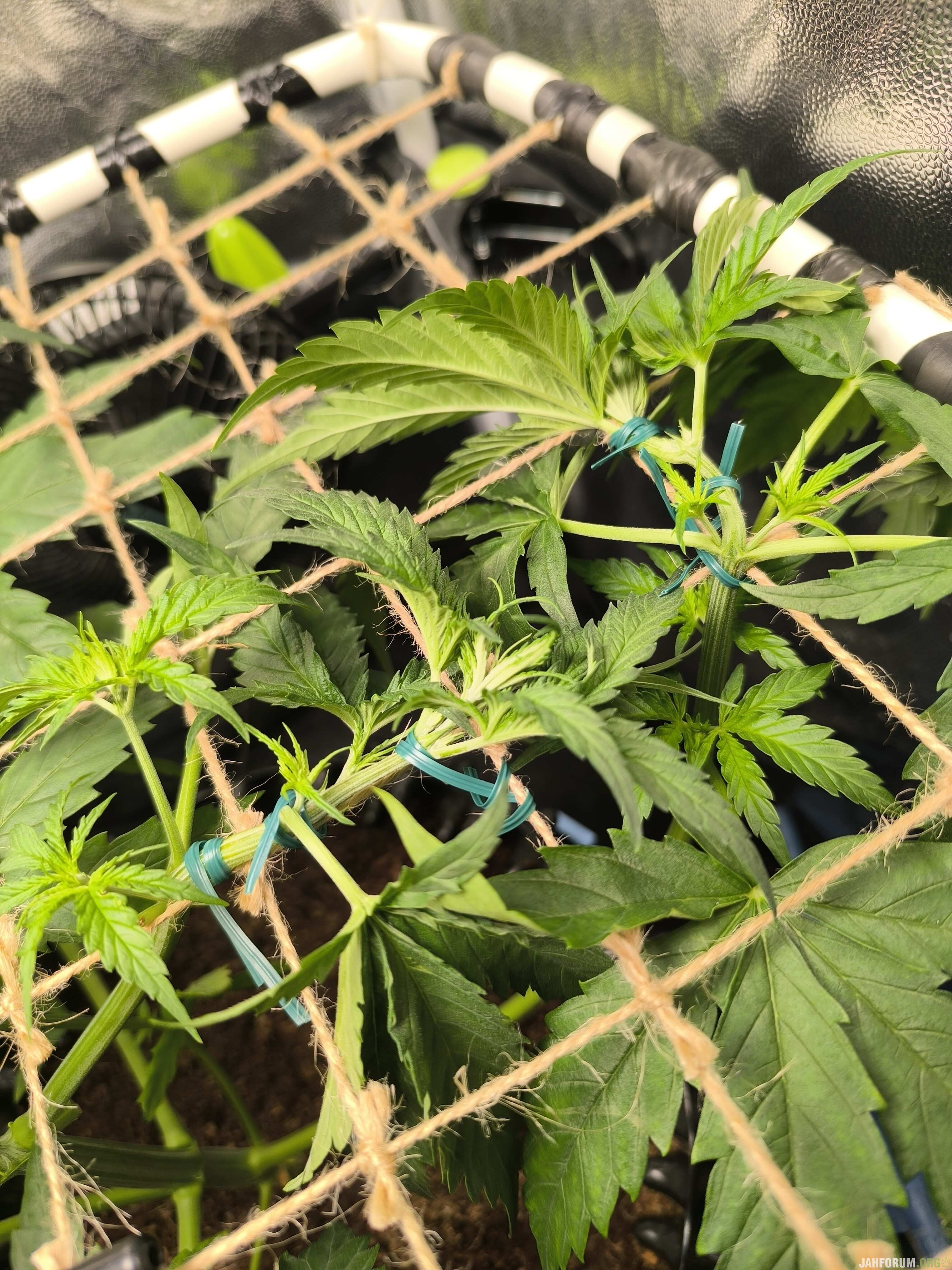 Dunulbul 1 640 Опубликовано: 10 июля 31 день Компот 4л (500мл дренаж) 5,8пш 1,3ЕС 650ппм Micro/Grow/Bloom 0,6/0,6/0,2ml/L Calmag/Fulvic/Seaweed 1,0/0,6/3,0ml/L Сьогодні продовжив гнути, щоб не ламати нові пагони які ще молоді, почав використовувати техніку поступової LST, товсті гілки тепер мотаю до сітки червоною стрічкою-липучкою яка взагалі то для кабелів призначена, ну то таке, а тонкі пагони буду гнути в два етапи тією своєю проволокою, товсті пагони вона ріже, а тонкі ще не з такою силою давлять при тургорі, тому безпечно. Поступово растішка відновлюється після моїх кривих рук. Всім Джа) 3 Гроурепорт #1 Мой первый опыт - 215г Гроурепорт #2 Lemon Kix Auto - 195г Поделиться сообщением Ссылка на сообщение Поделиться на других сайтах